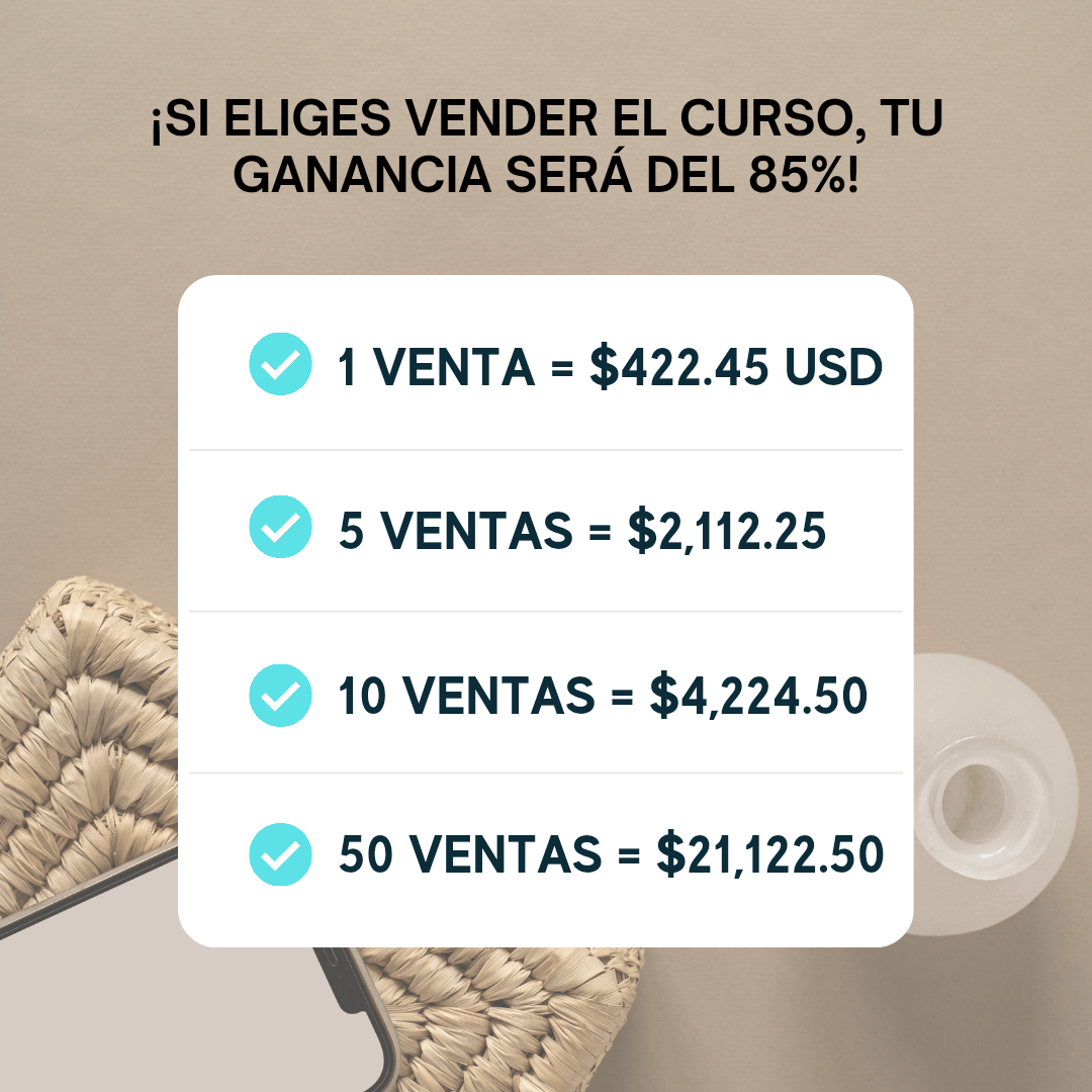 ¡Y lo mejor! Puedes revender este curso las veces que quieras y quedarte con el 85% de la ganancia ($422.45) en cada venta 💸.
