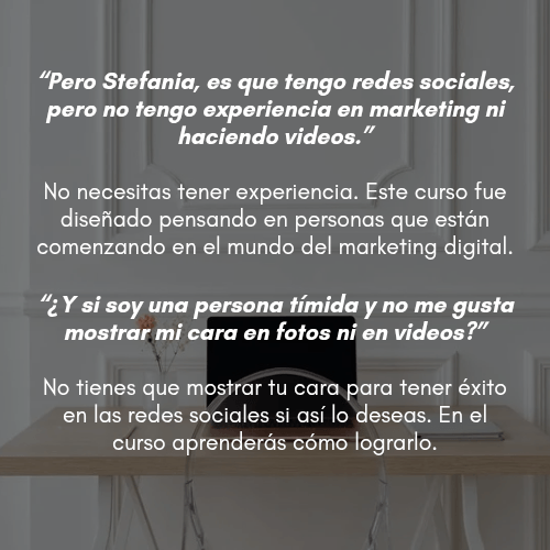 ¡CLARO QUE NO! Recuerda que todos en las redes sociales comenzamos desde cero. El curso te enseñará todo lo que necesitas saber sobre cómo configurar tu plataforma de redes sociales y crear contenido que to ayude a llegar y vender a tu público objetivo.